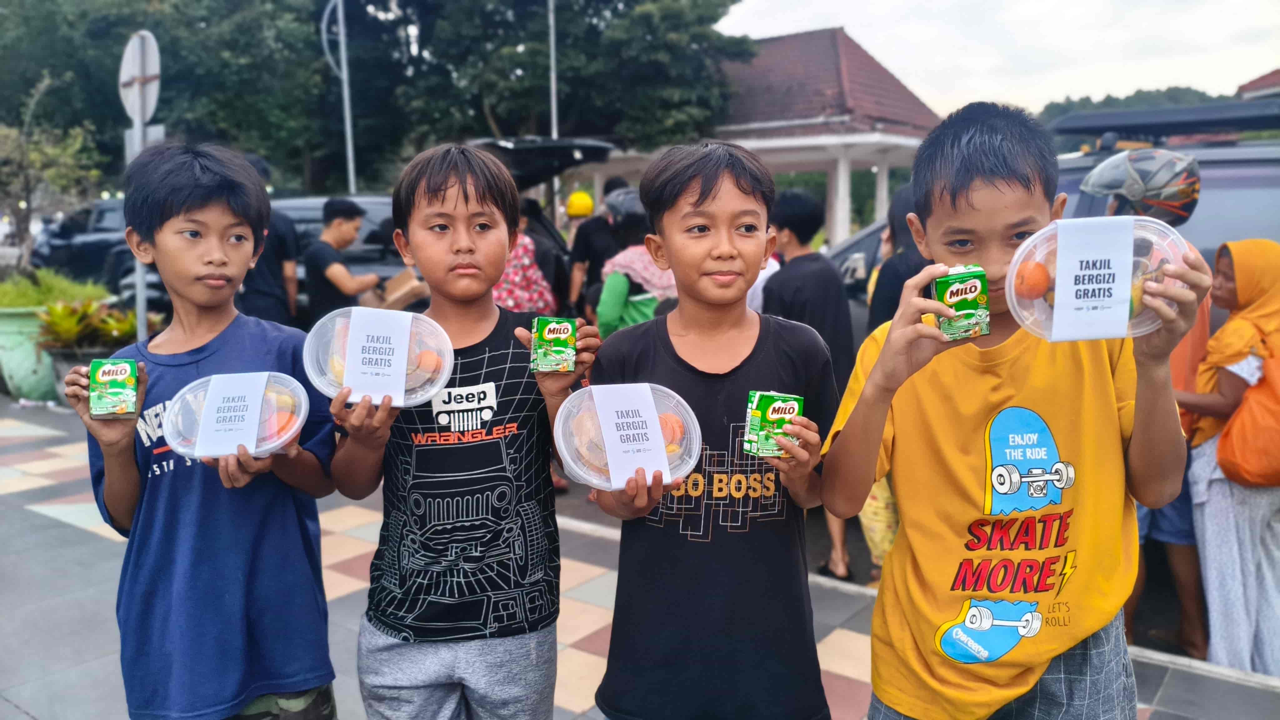 Berbeda dari pembagian takjil pada umumnya, paket yang dibagikan kali ini disusun menyerupai konsep menu pada program Makan Bergizi Gratis (MBG). Setiap paket berisi roti, kurma, pisang, jeruk, serta susu sebagai pelengkap nutrisi.